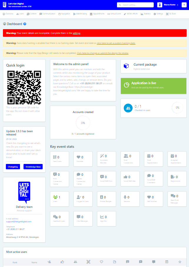 | Switch event                | If you have multiple environments, you can easily switch between admin panels via this button. Make sure your email address, code and password are the same in all environments. |